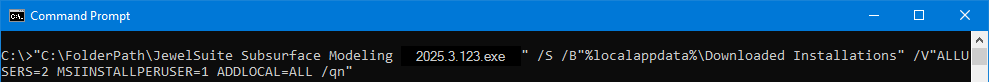 "C:\FolderPath\JewelSuite Subsurface Modeling 2025.4.1234.exe" /S /B"%localappdata%\Downloaded Installations" /V"ALLUSERS=2 MSIINSTALLPERUSER=1 ADDLOCAL=ALL /qn"