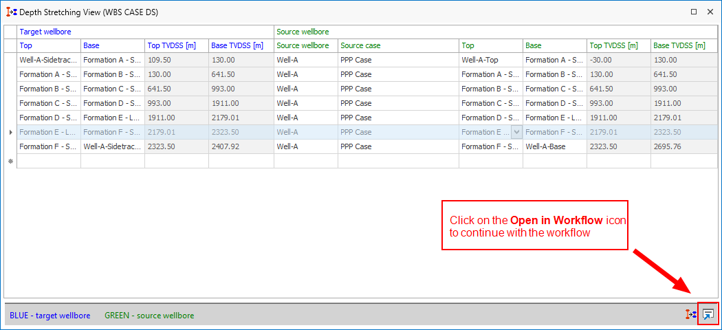 Using the settings on the Depth Stretching View, you select how and from where you want to stretch the logs. You can open the by clicking the Show DS View button (1D model > Mapping > Show DS View). In this view with a table format, you can review the top and base depth for each zone defined by two successive well markers, both in the source well and the target well. By default, the table is filled based on the markers from the source and the target case, but you can adjust it manually.