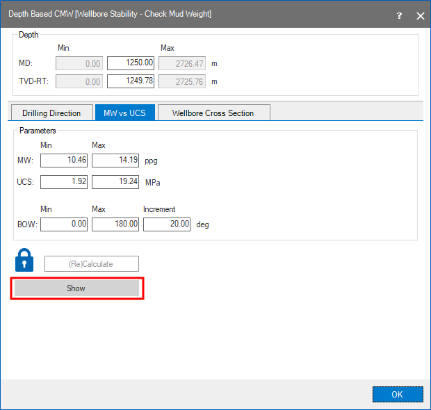 To open the Mud Weight vs UCS view, click the Show button in the MW vs UCS tab on the Depth Based CMW (wellbore stability > Check Mud Weight) form.