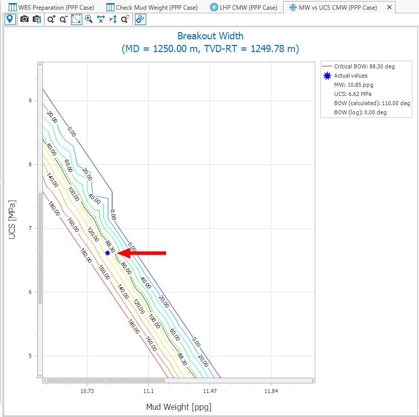 Blue stars indicate the parameter values corresponding to actual values at the current depth. Here in the CMW section it indicates the actual mud weight selected in the model and shows the resulting breakout width.