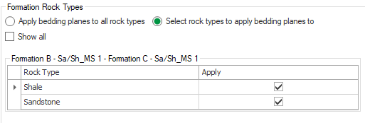 This allows you to apply the bedding plane properties to the selected rock types in each formation. By default, the option Apply bedding planes to all rock types is selected. By selecting the Select rock types to apply bedding planes to option, you can select the rock types for the active formation (the formation that has focus in the table above). The image below shows an example of this; Formation D has the focus in the table, indicated by the small black arrow to the left of the Formation D row, making Formation D active in the Formation Rock Types section. Next, you can check all the rock types to which you want to apply bedding planes to.