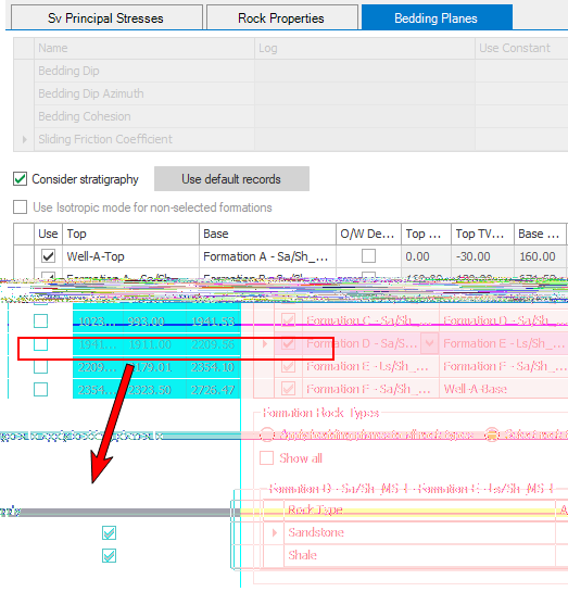 The Bedding Planes tab also contains an option to use existing stratigraphy as the basis of the bedding planes definition. When the Consider Stratigraphy checkbox is selected, you can combine bedding planes with isotropic mode if some of the formations are not selected. This will result in a combined breakout width and a collapse pressure log for the Check Mud Weight and Predict Mud Weight, respectively.