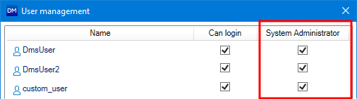 System Administrators have the 'Admin Account' checked on the User management form, accessible via the Manage users button on the DMS Options form. click to enlarge