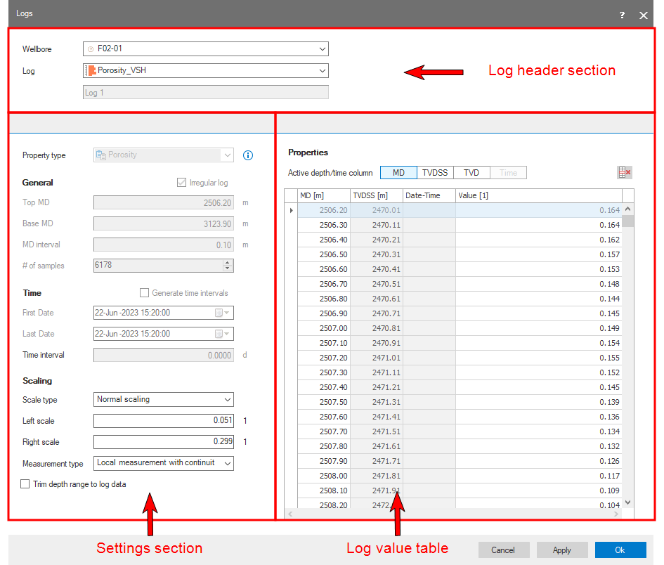 The Logs form consists of three distinct sections; the log header section at the top of the form, the settings section on the left side of the form and the log values table on the bottom right. In the header section you may specify information such as the wellbore and log name. In the settings section you can edit property type, general, time and scale settings. At the bottom right of the form the properties and log value table can be configured.