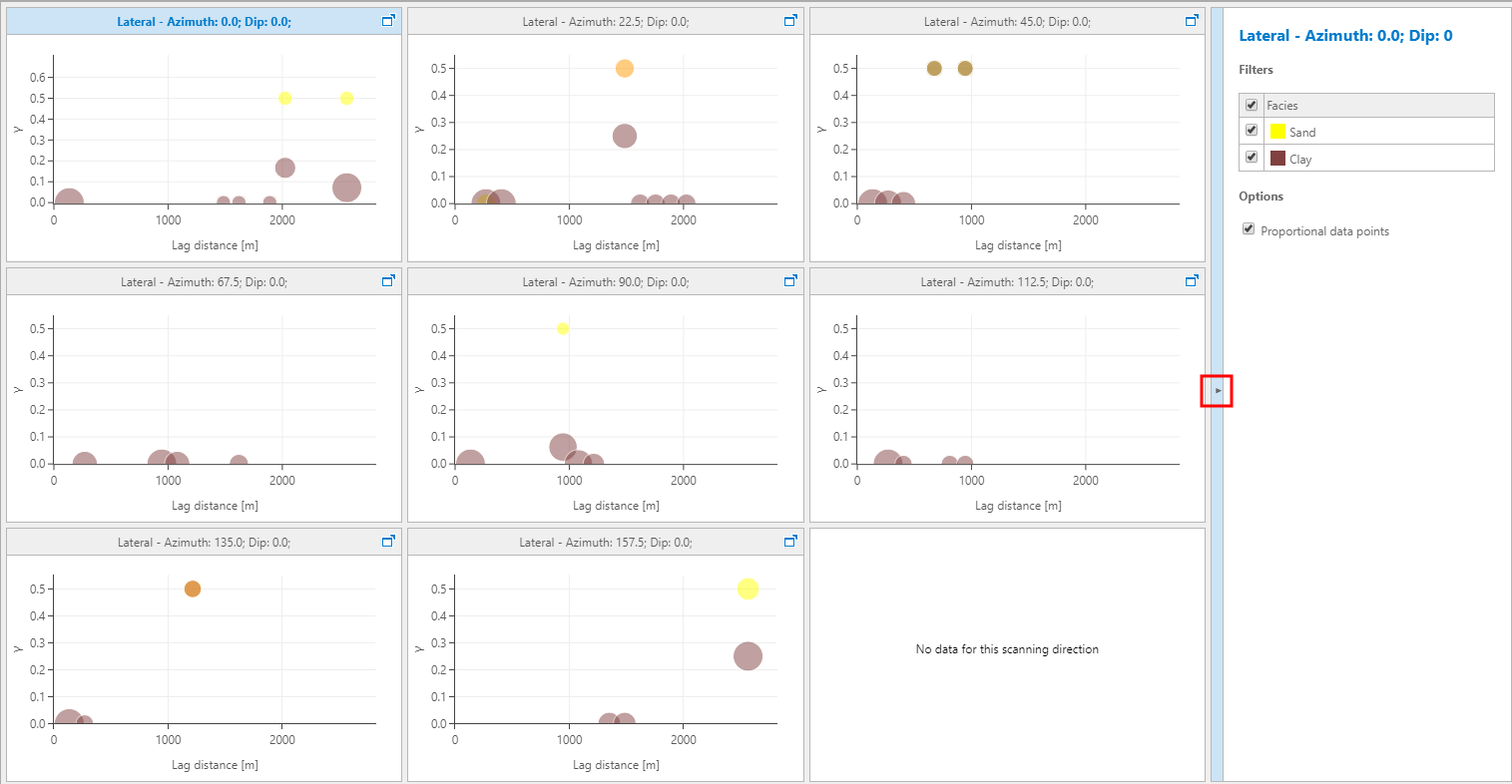 • Displaying data points - For each facies that you want to visualize, check the checkbox in the toolbar on the right side of the view. The selection you make here is applied to all the displayed variograms in the view.