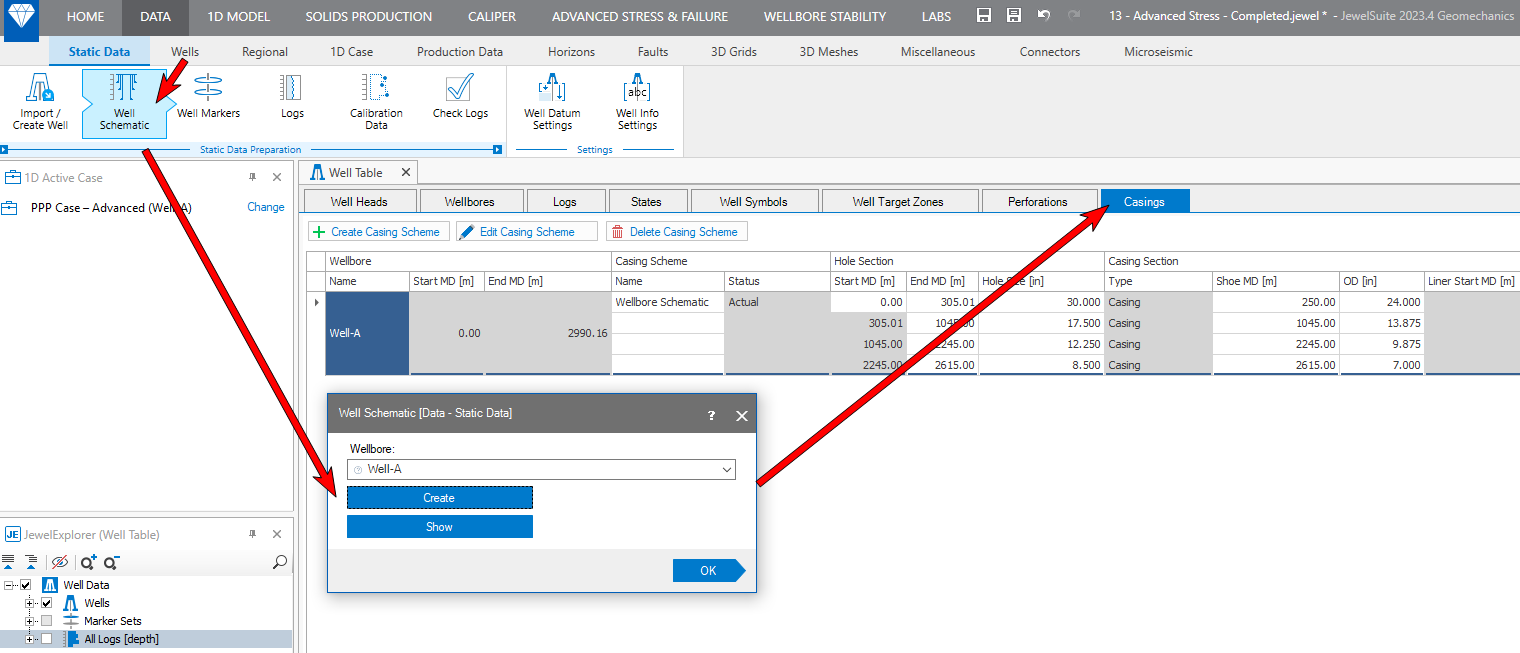 Go to DATA > Static Data > Static Data Preparation > Well Schematic. Then from the Well Schematic form, select the Create option to open the Casings tab in the Well Table.