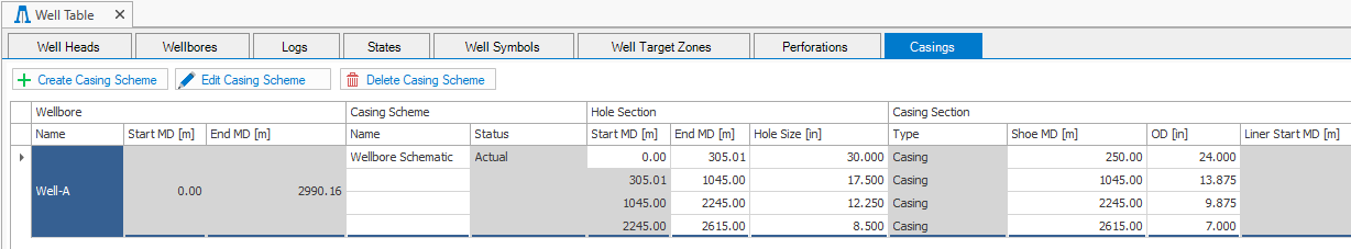 Right-click the Wells item in the JewelExplorer and select Well Table from the context menu to open the Well Table where you can edit the following well and wellbore data: