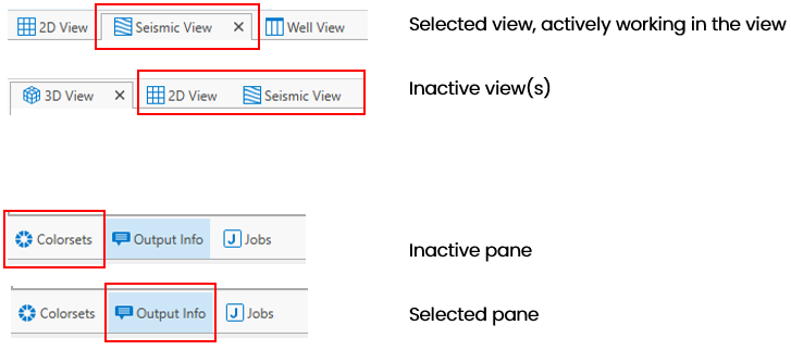 Opening a view using the Views drop-down list or the Create option in the context menu of the View Explorer, adds a view to the view area, whereas opening a pane from the Panes drop-down list opens a pane at a preset location for panes in the interface. You can recognize a view from a pane not only by the location where it is opened. A view has a tab at the top of the view area, displaying the name of the view. This tab can have different states: