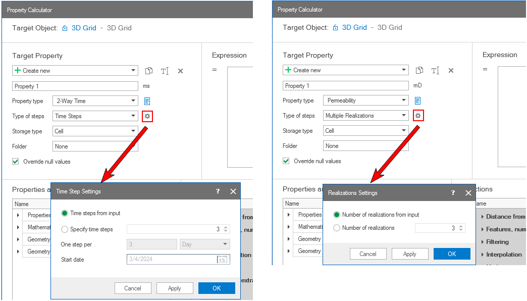 When you are creating a property with multiple time steps (left image) or realizations (right image), you can click the icon behind the 'Type of steps' drop-down list, which opens a dialog where you can specify the input method to create the property.    click to enlarge