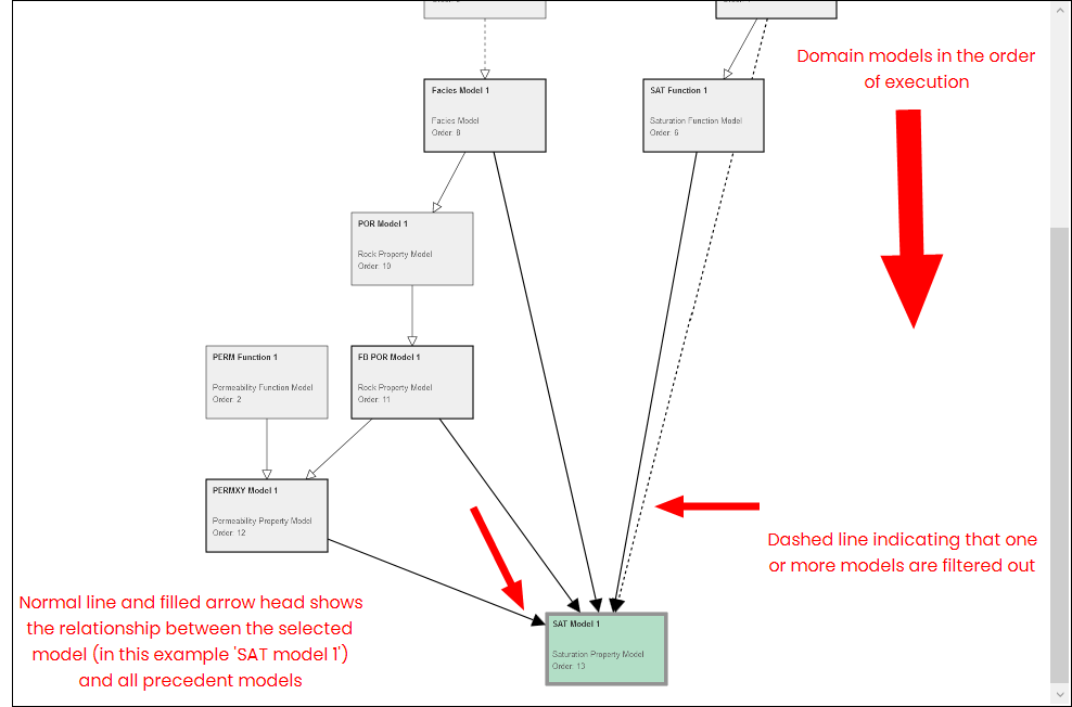 Using the Dependencies Analyzer in the Tools button group (Concept > Concepts > Tools), you can view the input dependencies of the domain models that define the saturation model assigned to the selected concept. On the form, the models are listed in the order of execution. The saturation model and net-to-gross model are included as well.