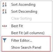 The context menu of the column headers has the options to open the Filter Editor dialog and to open the Search Panel to filter information in the dependency table.    click to enlarge