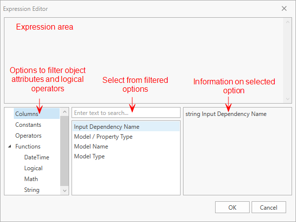 You can view the relationship between domain models and input dependencies in a table, a matrix or a graph format. The form also allows you to simultaneously compare the dependency table, matrix or graph with another volumetric concept. You can export the results to a spreadsheet for further analysis. With the filter and search functionality, you can perform a quick search, or create custom expressions to filter the results on model name, model type and input dependencies.
