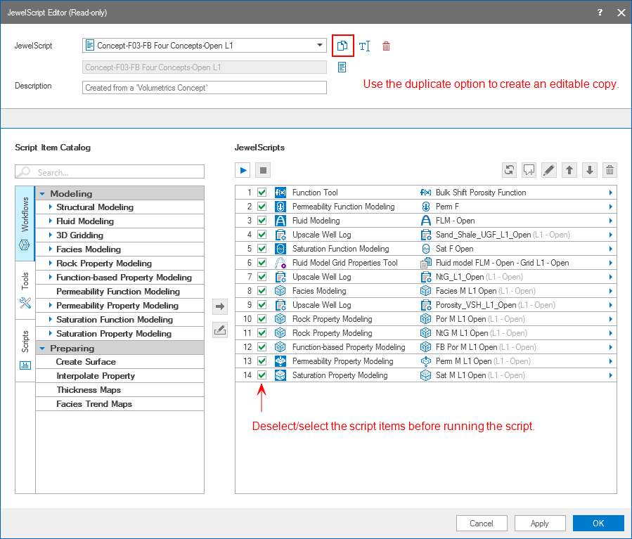 Access the newly created JewelScript(s) in the Script Explorer or via the JewelScript Editor tool. On the JewelScript Editor form, use the toolbar options to duplicate, rename or delete the script. In the JewelScripts section on the form you can deselect script items that you want to exclude before running the script. Note that you cannot add any new script items from the Script Item Catalog, or modify or rearrange the script items.