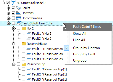 To use the JewelExplorer, first locate the fault cutoff lines under the 3D Structural Model > Fault Cutoff Line Edits folder. Here, you find the calculated fault cutoff lines grouped (in folders), initially by horizon name (default setting). You can, however, group them differently, or not at all. To do this, open the context menu of the 'Fault Cutoff Line Edits' folder and select your preferred grouping option (see image below). Once located, you can check the box for each fault cutoff line to visualize it in the 'Solve Fault Cutoff Lines 3D View'.