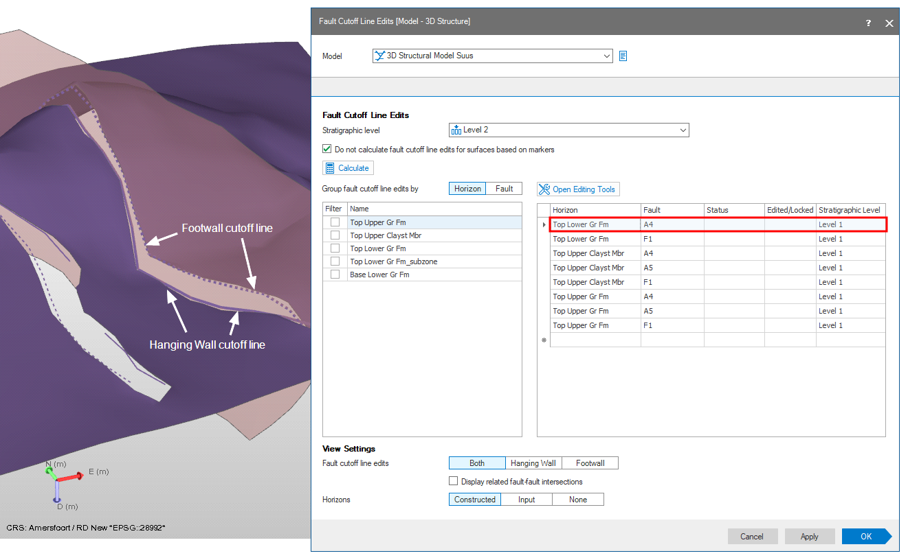 Fault cutoff lines are the locations where the faults intersect with the horizons in your structural model. With the Fault Cutoff Line Edits form (Model > 3D Structure > Fault Cutoff Lines) you calculate these lines that can be inspected and optionally edited. The position of these lines, pre-editing, are determined by the horizon input data, the horizon construction settings (proportional/conform) and the hierarchical relationships with other horizons. You can manually edit these lines, as such influencing the location of the horizon-fault intersection, after which the horizon surfaces will be reconstructed (taking along the edits) by clicking Apply or OK at the base of the form. This functionality can be important for structurally complex reservoirs where juxtaposition along the faults is a crucial factor.