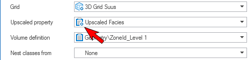 4. Select the Upscaled property that you want to use as input for modeling. The property needs to be stored in the 3D Grid> 'Upscaled Properties' folder in the JewelExplorer to be available for selection. Only discrete grid properties can be selected. If you have not created this property yet, create it with the model > Facies > Tools > Upscale Well Log tool.
