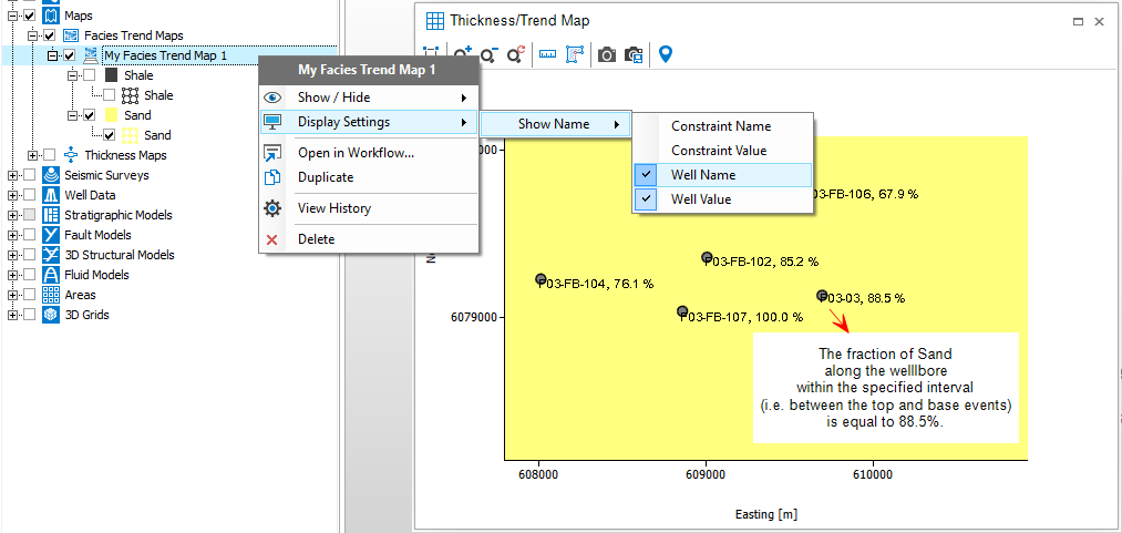 Once you click OK or Apply, a dedicated view called Thickness/Trend Map appears in the view area. At this point of the workflow you do not have a facies trend map yet, it will be ready after interpolation. The Thickness/Trend Map view displays values at well locations: each value represents the fraction of the facies along the wellbore within the specified interval (i.e. between the top and base events).