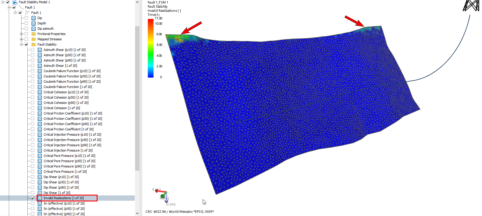 When negative sampling happens for pore pressure, fault friction coefficient and/or fault cohesion, the realization will be deemed 'invalid'. The output properties of the fault stability calculation will be set to 'undefined' for that node and the property 'Invalid Realizations' is created. The image below shows the output of the above case, with the 'Invalid Realizations' property displayed. As expected some negative samples occurred at the top of the fault (red arrows).