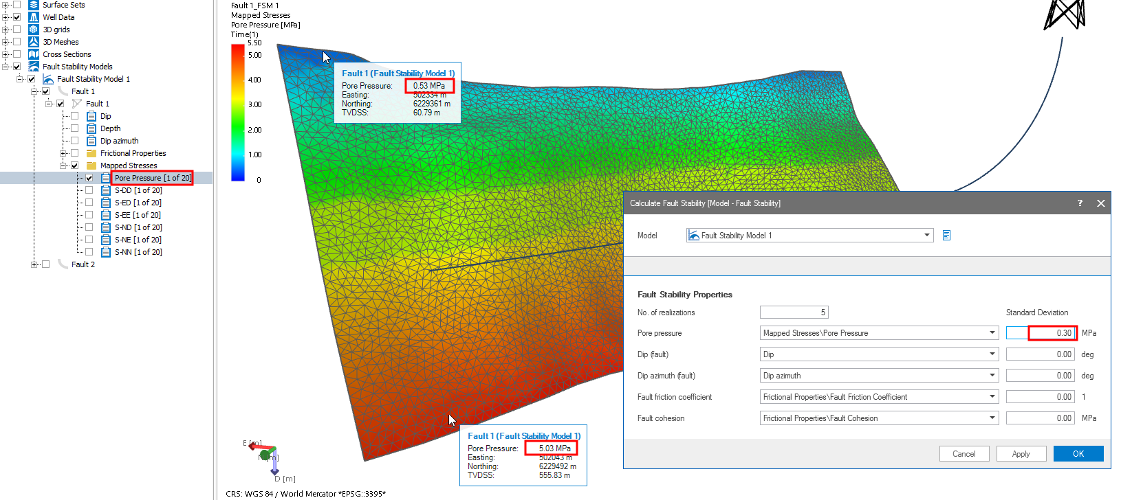 Example showing a standard deviation which leads to negative sampling in those areas where the property values are lowest. The area at the top of the fault (in dark blue) with pore pressures of around 0.5 MPa will end up with negative samples when -2 sigma (or lower) is sampled with the current standard deviation of 0.3 (i.e., 0.53 + (-2*0.3)=-0.07 MPa). click to enlarge