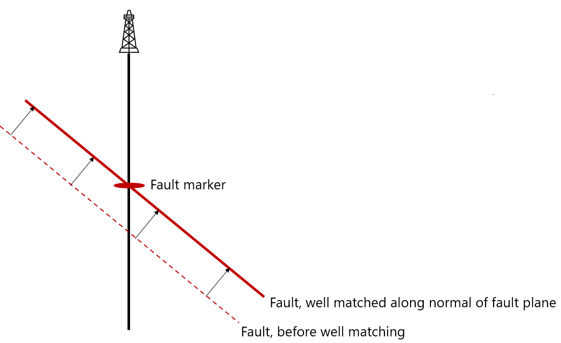 As a result of the well matching, the fault surface shifts in space to align with the fault marker location. Both the calculation of the residual and the direction of the well matching correction takes place along the normal of the fault surface. Correction along the vertical axis could result in a large vertical shift of the fault plane as a fault plane is generally steep.