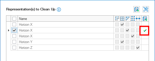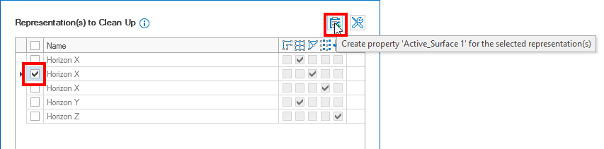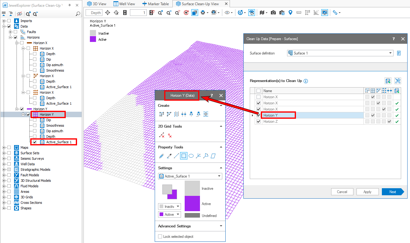 Except for markers, data clean-up is performed in a dedicated 'Surface Clean-Up View', which automatically opens when you select a representation on the Clean Up Data form. In the view, with the 'active property' selected, you set parts of the representation to inactive with the Editing Tools > Property Tools. To set markers as inactive you use the Marker Table, as this cannot be done in the view.