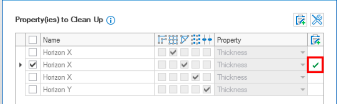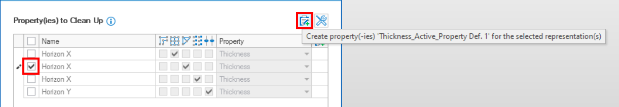 - To specify the representations for which you want to create the 'active property': Check the box(es) of the representation(s) for which you want to create the 'active property' (the Clean-Up View opens). Then click the 'Create property' icon (Image 1 below). A green checkmark in the last column of the table indicates that the 'active property' has been created (Image 2 below). You can find the property under the respective representation in the JewelExplorer, carrying the name 'property name_Active_property definition name'. For markers, the active property is stored under Well Data > Marker Set > the respective marker.