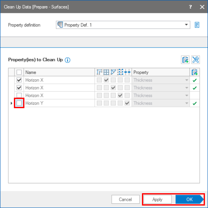 - To specify which 'active properties' you want to use during property creation: When you click Apply/OK at the base of the form, 'active properties' will be used (during property creation) only for the objects that have their boxes checked. 'Active properties' of unchecked representations will be ignored during property creation meaning all the data of those representations is considered input. This allows for easy comparisons of output surfaces with and without 'inactive data'.