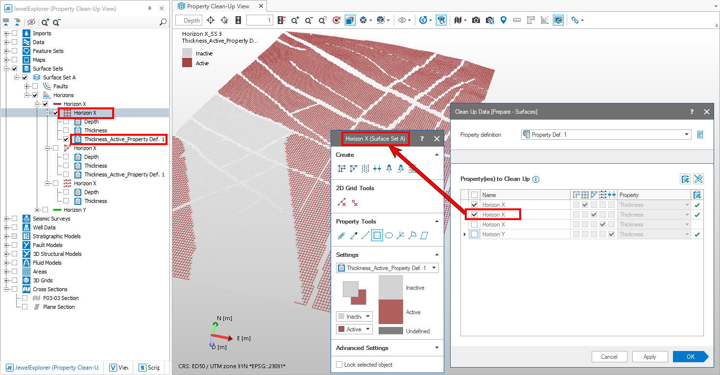 The editing tools floating palette and the Property Clean-Up View respond to the representation you select in the table (Horizon X in the example above). Note the gray band on the 2D grid in the view: these are nodes set to 'inactive'. click to enlarge