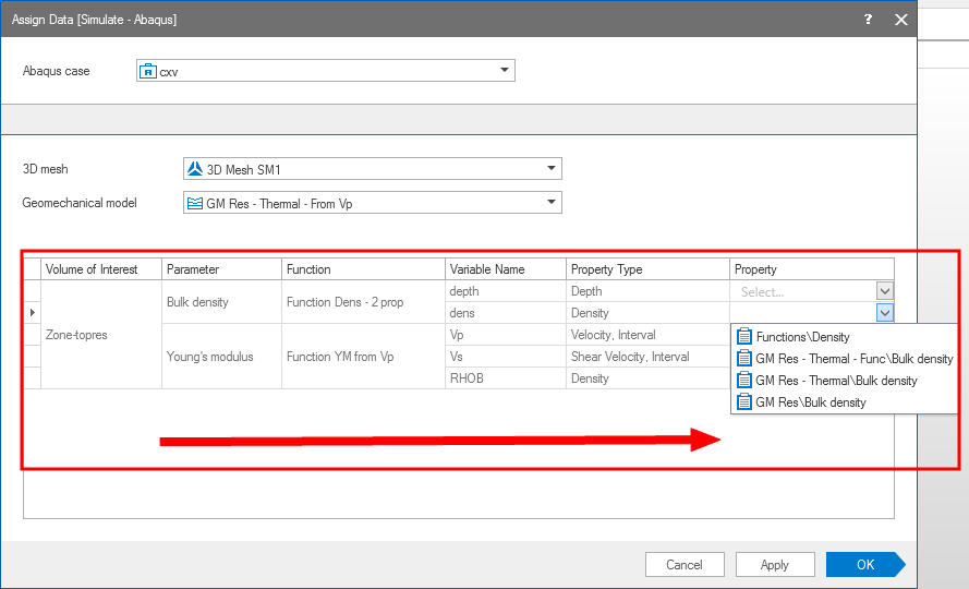 If the selected geomechanical model uses functions to calculate material parameters, the form displays a table listing these parameters per VOI. For each variable that is used in a function, assign an existing property in the Property column. From the drop-down list, you can select a property that has the required property type and is available for the selected 3D mesh. Properties from another geomechanical model mapped to the same 3D mesh can also be used.