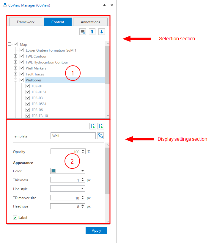 1. The top part of the CoView Manager is the Selection section, where all objects available for display are listed. These objects are organized into tabs: framework elements in the Framework tab, data in the Content tab and annotations in the Annotations tab.