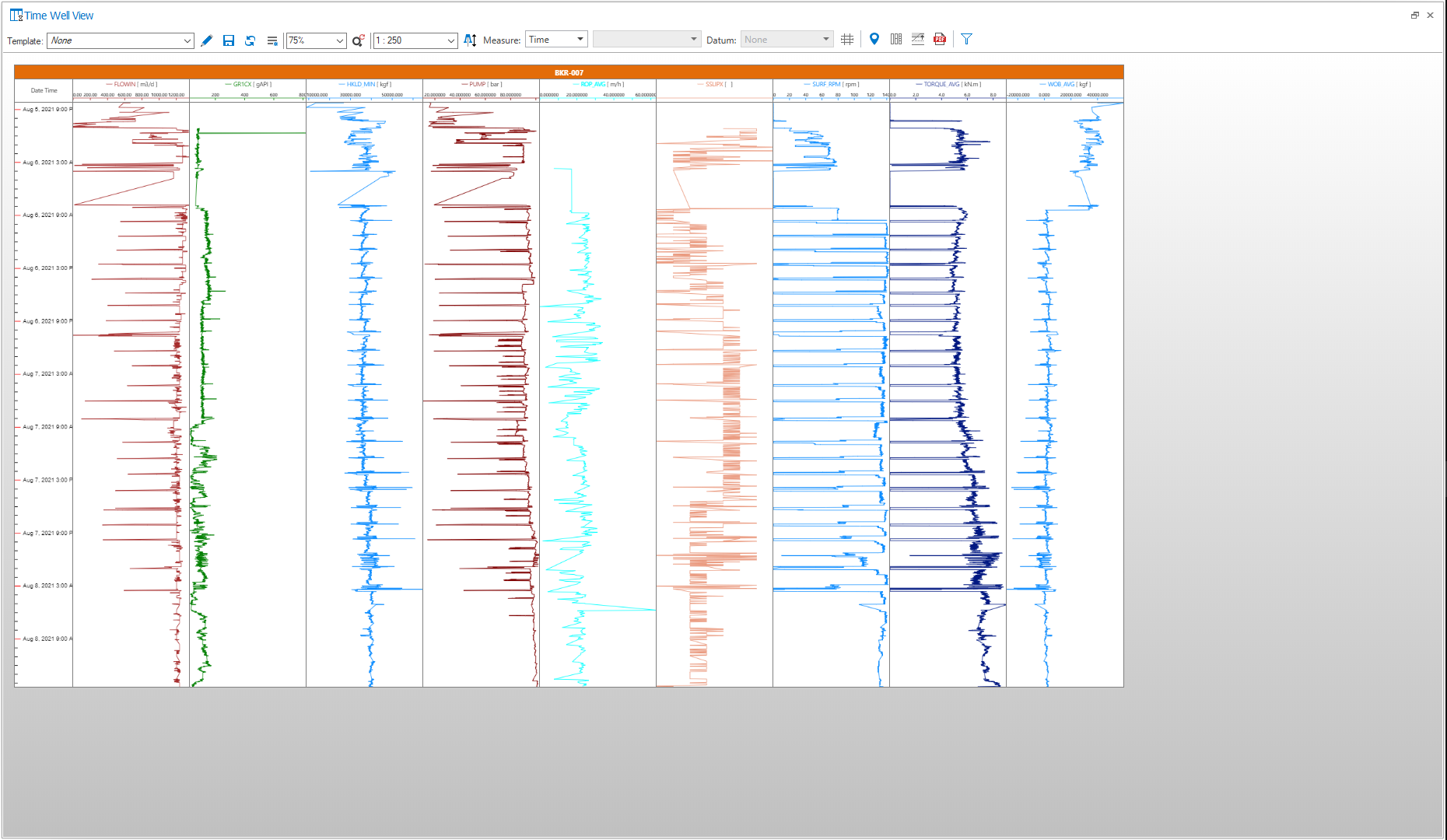 The Time Well View displays well logs based on time only. The view plots continuous logs and discrete logs and can visualize well events. You can open the view via the Views button in the top-right corner of the application. You can visualize each well, log, well event, and marker of interest by checking its corresponding box in the JewelExplorer. You can also select a template from the drop-down list for visualizing the data.