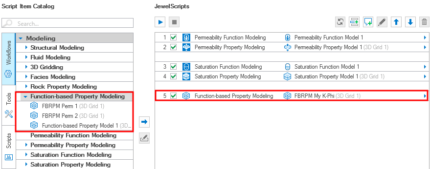 Deletes the active JewelScript. - Build the JewelScript with script items from the Script Item Catalog. If you want to quickly find a specific script item in the catalog list, start typing in the search field above, and the list will filter to display relevant items. In the case of Workflows, you can either select the modeling workflow, or use the drop-down arrow to the right of the workflow to select the associated domain model.