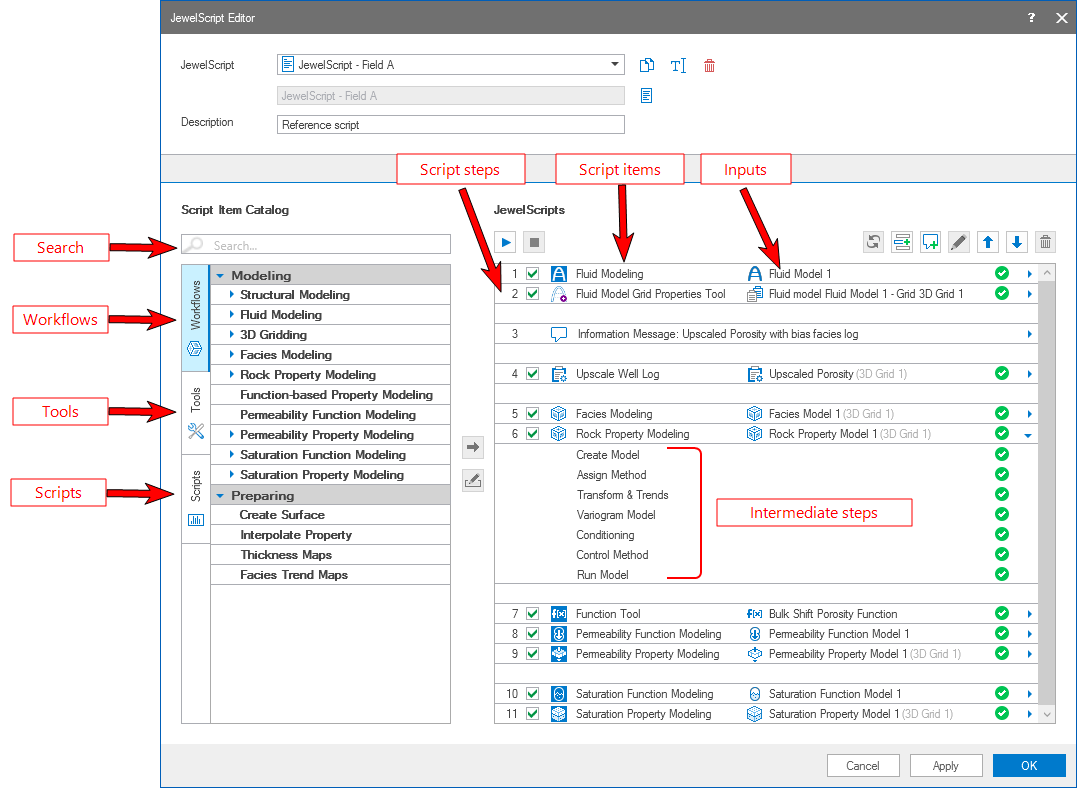The primary objective of JewelScripts is to improve the automation capability of the modeling workflows, tools and (nested) JewelScripts. JewelSuite 2026.1 Subsurface Modeling allows you to create JewelScripts wherein you can change the inputs in the intermediate steps of the modeling workflows and tools. When you make changes to the intermediate steps in any of the script items via the JewelScript Editor and click Apply at the base of the JewelScript Editor form, the changes are saved to the JewelScript. At this point, the changes on the form that you made via the Editor are not transferred yet to the same form in the workflow strip. This is called 'decoupled JewelScript'. The input changes are incorporated on the forms on the main strip only when you Run