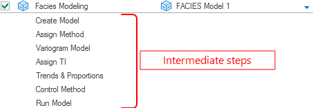 - Script items which are workflows can consist of many workflow steps (e.g. Facies Modeling contains several workflow steps: Create Model, Assign Method, Variogram Model, etc.). In the Script Editor, these steps are called 'intermediate steps', see image below. Visualize these intermediate steps with the small arrow at the right side of the script item. To access the form of an intermediate step, double click on the step or use the Edit selected item icon
