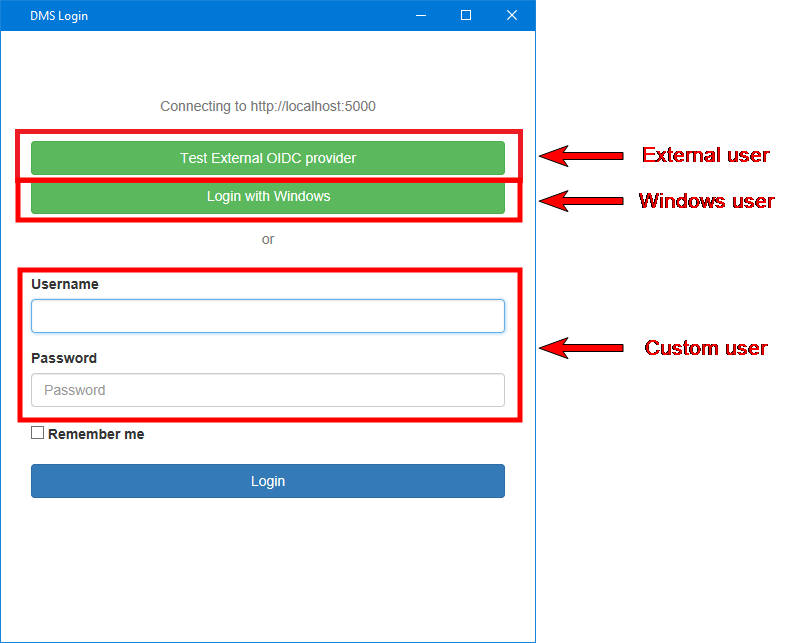 If you perform an action which requires a connection to DMS while you are not connected yet, the Connect to DMS dialog automatically opens. This is for example the case when you use 'Open from DMS', 'Save to DMS', or some of the other buttons of the Data Management Solution button-group.