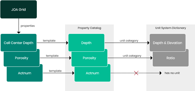 The connection of three grid properties (Cell Center Depth, Porosity and Actnum) to corresponding property templates and the Unit System    click to enlarge