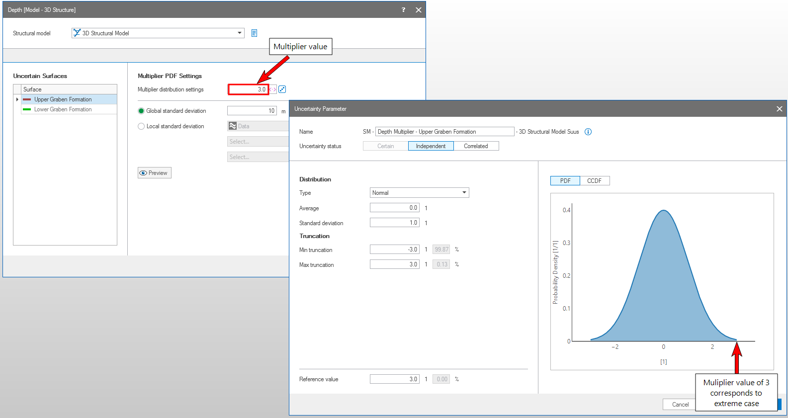 In this example, the selected surface (Upper Graben Formation) will shift with a multiplier value of 3 standard deviation. This will result in a relatively high amount of shift for this scenario, as 3 is the upper limit of the Probability Density Function of the surface.    click to enlarge