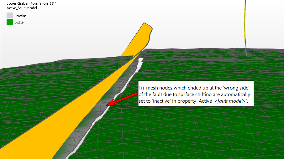 In green a shifted surface with a horizon clean-up property displayed. In orange a fault of the structural model. Tri-mesh nodes at the 'wrong' side of the fault are automatically set to 'inactive' (color gray). 'Inactive' parts will be ignored during surface construction of the new structural model, ensuring proper horizon-fault offsets.    click to enlarge