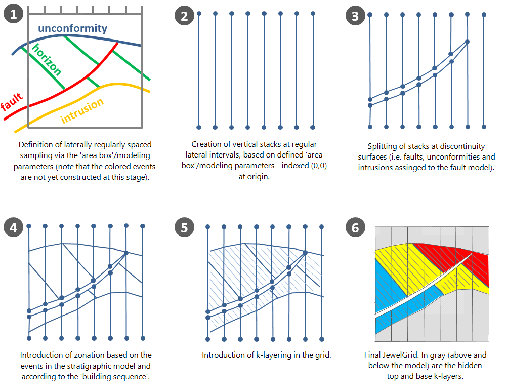 The required inputs for the JewelGrid are surfaces defined by 2D grids, polyline sets, tri-meshes, point sets or well marker sets. Different representations can be combined to represent one geological event (e.g. a horizon, fault, etc.). The process of grid construction is stepwise (see image). Of these steps, the first four steps are performed with the structural modeling workflow, resulting in a structural model with internal stratigraphic zonation (here, the JewelGrid is used as explained below, but 'under the hood'). Step 4 takes place in the Structural Modeling workflow (resulting in the 3D Structural Model), Step five takes place in the 3D Gridding workflow (resulting in a 3D grid with internal k-layering).
