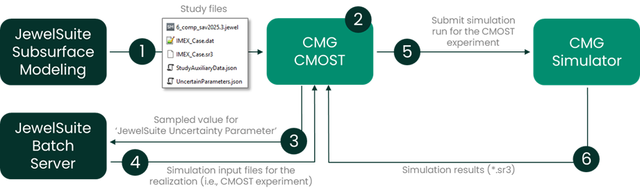 - CMOST sends the sampled the uncertainty parameters to JewelSuite Batch Server for the experiment.