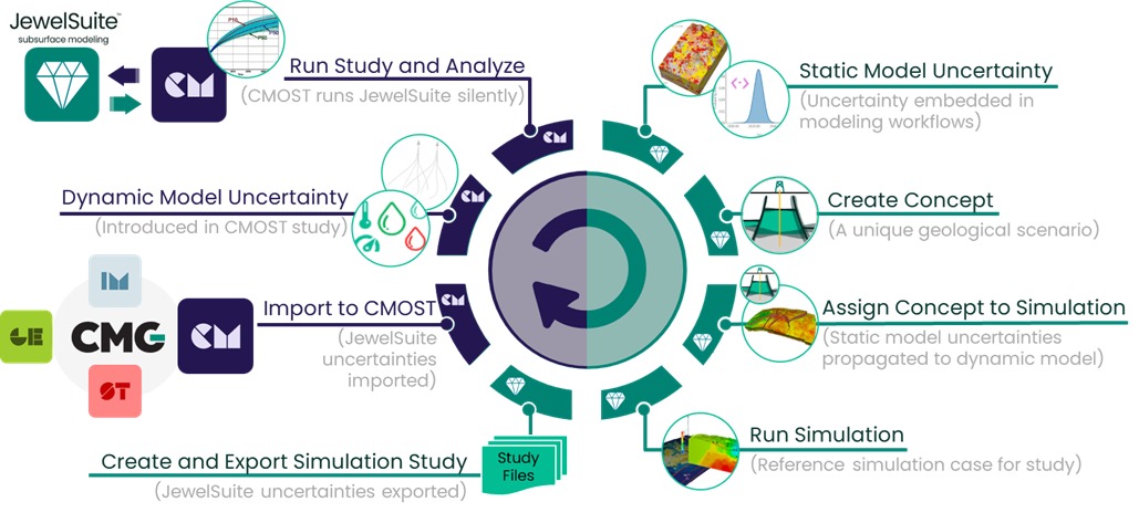 The JewelSuite - CMOST integrated workflow. The steps shown in green are performed in the JewelSuite user interface, while the steps shown in purple are performed in the CMOST user interface. click to enlarge