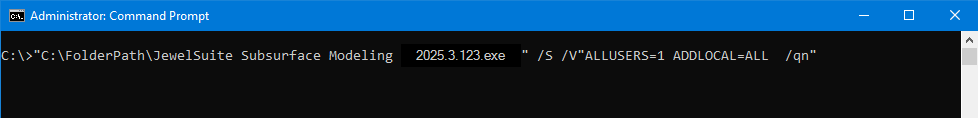 "C:\FolderPath\JewelSuite Subsurface Modeling 2025.4.1234.exe" /S /B"%localappdata%\Downloaded Installations" /V"ALLUSERS=2 MSIINSTALLPERUSER=1 ADDLOCAL=ALL /qn"
