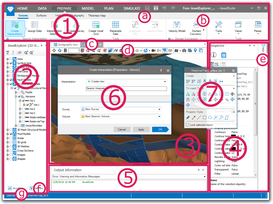 The JewelSuite 2026.1 Subsurface Modeling workspace. (1) The Strip. (2) The JewelExplorer. (3) View area. (4) Pane area. (5) Output information. (6) A form. (7) Floating palette. (a) shows the quick access toolbar, (b) an arrow that reveals the rest of the strip, (c) the view tabs, (d) a view toolbar, (e) auto-hidden panes, (f) tabs at bottom on pane, and (g) the status bar. click to enlarge