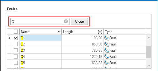 Forms that contain one or more tables, have search functionality for these tables. To enable the search functionality, first click inside the table. Use the Ctrl+F key combination to activate the search functionality. Type an entry, the search will start immediately. The search functionality acts as filter, only those entries that contain the search term are listed in the table. Press Esc or click Close to close the search and remove the filter from the table.